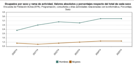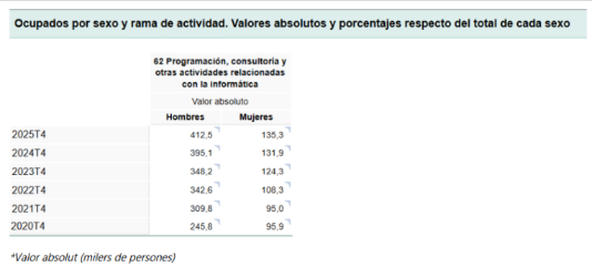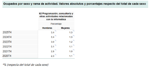 Volvamos a los datos. La presencia masculina en el conjunto de actividades tecnológicas sigue siendo ampliamente mayoritaria a nivel estatal, especialmente en la Categoría 62 del INE, que agrupa las profesiones vinculadas a los servicios informáticos y tecnológicos. Si bien se detecta un ligero incremento porcentual de mujeres ocupadas en el sector, este crecimiento es muy inferior al de los hombres —lo que confirma la persistencia de una desigualdad estructural que no remite.
