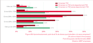 Otro estudio interesante sobre la brecha de género en Cataluña proviene del Barómetro del sector tecnológico en Cataluña 2025 del Cercle Tecnològic, según el cual solo un 8,4% de las empresas del sector TIC cuentan con una plantilla formada en más de un 50% por mujeres.