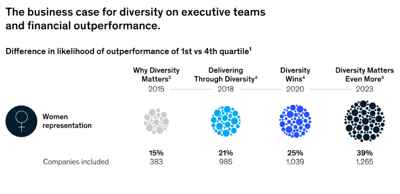Els estudis internacionals ho corroboren. L’informe Diversity Wins (2020) de McKinsey & Company —consultora de referència mundial en estratègia empresarial, present en més de 65 països— va analitzar 1.039 empreses de 15 països i va concloure que els equips diversos són més innovadors, més productius i fins a un 25% més propensos a obtenir una rendibilitat superior a la de les empreses menys diverses en matèria de gènere.