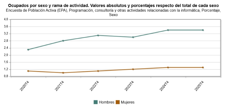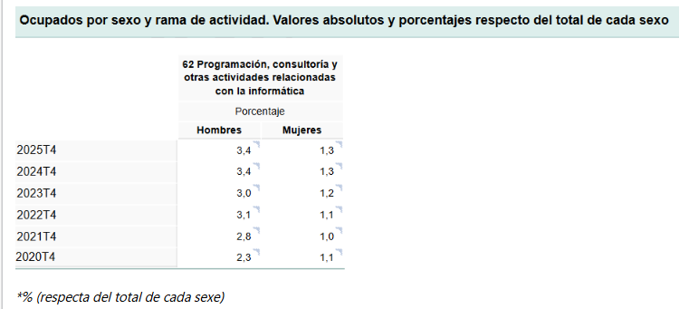 Tornem a les dades. La presència masculina en el conjunt d’activitats tecnològiques continua sent àmpliament majoritària a nivell estatal, especialment a la Categoria 62 de l’INE, que agrupa les professions vinculades als serveis informàtics i tecnològics. Si bé s’hi detecta un lleuger increment percentual de dones ocupades en el sector, aquest creixement és molt inferior al dels homes —fet que confirma la persistència d’una desigualtat estructural que no remet.