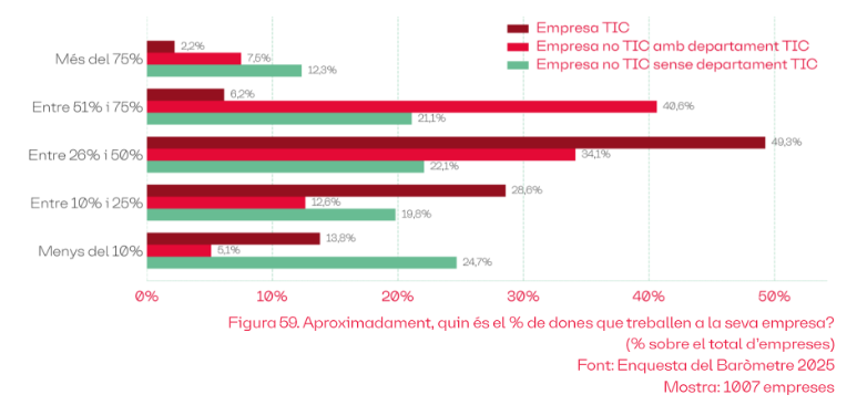 Un altre estudi interesant sobre la bretxa de gènere a Catalunya surt del Baròmetre del sector tecnològic a Catalunya 2025 del Cercle Tecnològic on només un 8,4 % de les empreses del sector TIC compten amb una plantilla formada en més d’un 50% per dones.